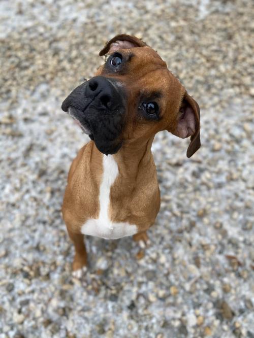 - Age, Size, Sex, Breed: Young, Medium, Male, Boxer Mixed Breed Mix